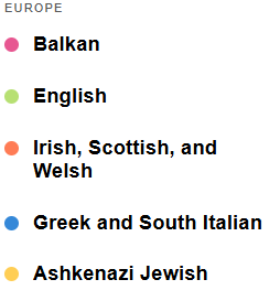 After Asia, most of my DNA is not African as I had supposed, but European, particularly Balkan, as indicated by the pink area in southeastern Europe on my map. It includes Romania, Bulgaria, Hungary, Sebia, Croatia, Kosovo and Bosnia and Herzegovina. On the surface, it may seem baffling that my ancestors were Balkan, until one takes the long view of human migration. The Balkans has sizeable Roma populations, and the Roma originated in northern India, the name evolving from the original Sanskrit, doma, the “untouchable” Dalit caste. The Romani language, Romanes, is an Indo-Aryan language, and the sixteen-spoked red chakra wheel on the Roma flag denotes our Indian origins. It is to this population of Balkan Roma that my South Asian DNA has been linked.